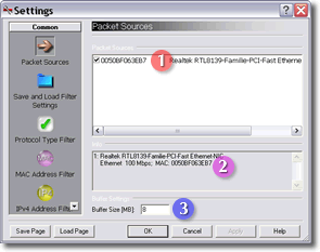 The Packet Sources list contains all active network interface cards found on the system. The left column contains the MAC address of each card, the right column gives a short description. If more than one NIC is installed, you can choose from which cards to collect packets by checking or unchecking the entries. At least one entry must be checked. You can distinguish the packet sources of the collected packets in the Packet List View by means of the text color of the Time/Length information. The color can be changed in the Packet Source View. |